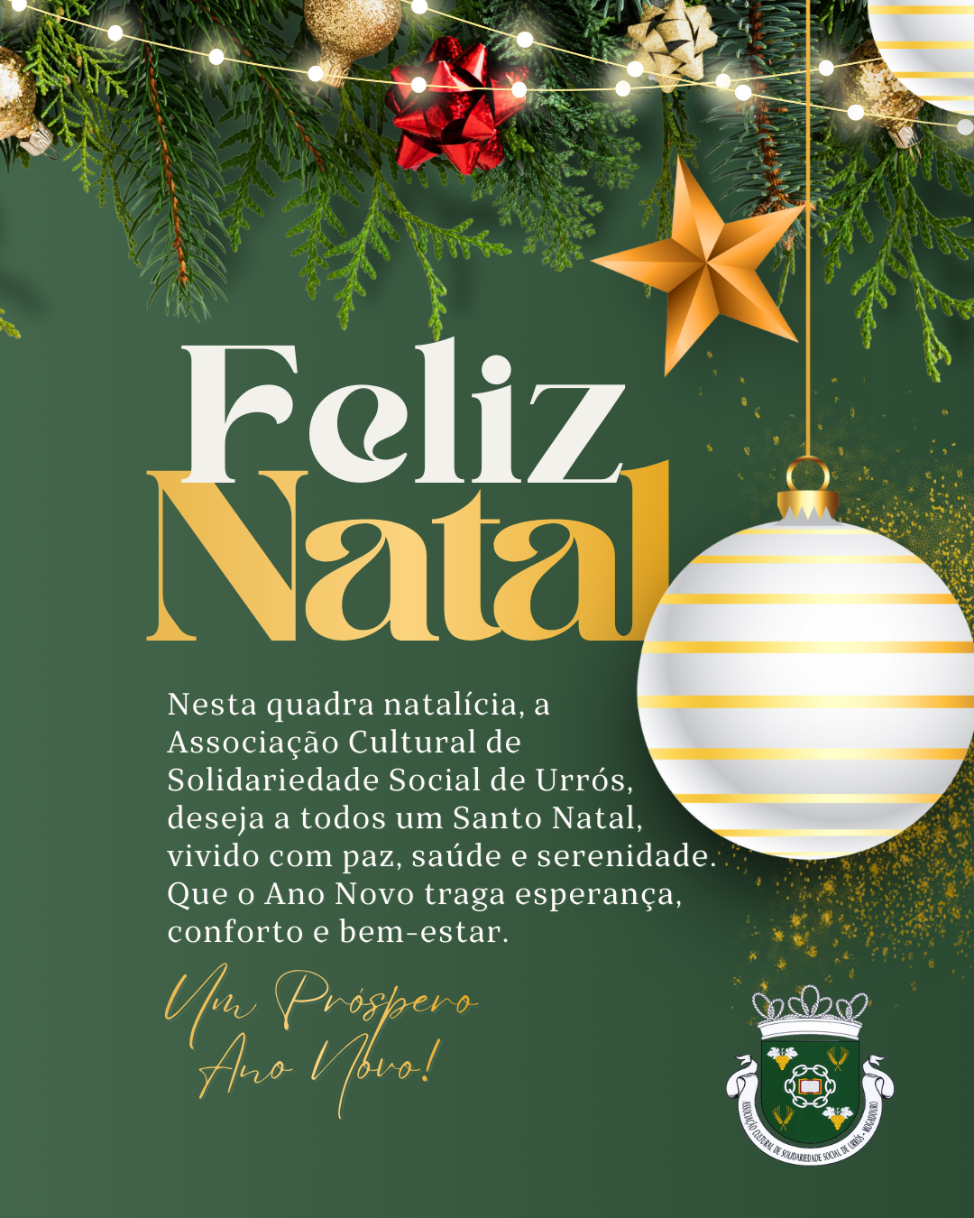 Nesta quadra natalícia, a Associação Cultural de Solidariedade Social de Urrós, deseja a todos um Santo Natal, vivido com paz, saúde e serenidade. Que o Ano Novo traga esperança, conforto e bem-estar.